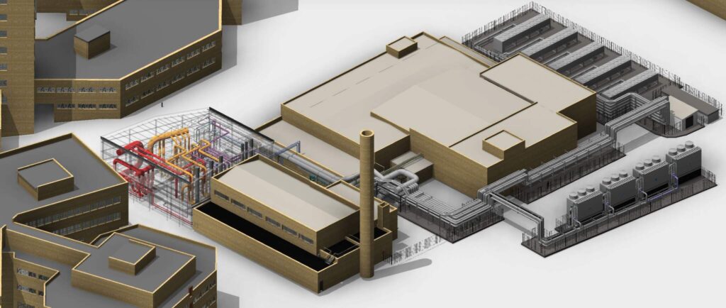 Entre las revolucionarias actuaciones propuestas y con el fin último de diversificar y maximizar la eficiencia energética, la iniciativa de Savener incluye el diseño completo de una nueva sala de calderas anexa a la ya existente, que albergará las nuevas unidades de producción de vapor y todos los elementos anexos a ellas, así como las nuevas calderas de agua caliente y los grupos de bombeo de los circuitos primarios y secundarios para la distribución del agua caliente, mediante una anillo de reparto, a los edificios de hospitalización del complejo: el Hospital General, el Hospital de Rehabilitación y Traumatología y el Hospital de la Mujer.